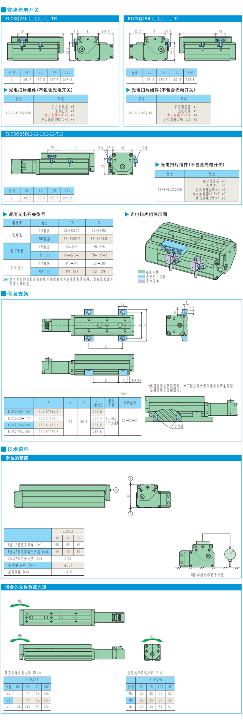 1.请在额定负载范围内使用滑台:请根据MAX搬运重量、允许力矩进行型号选定。如在超负荷使用,会造成导轨部产生间隙、精度变差。