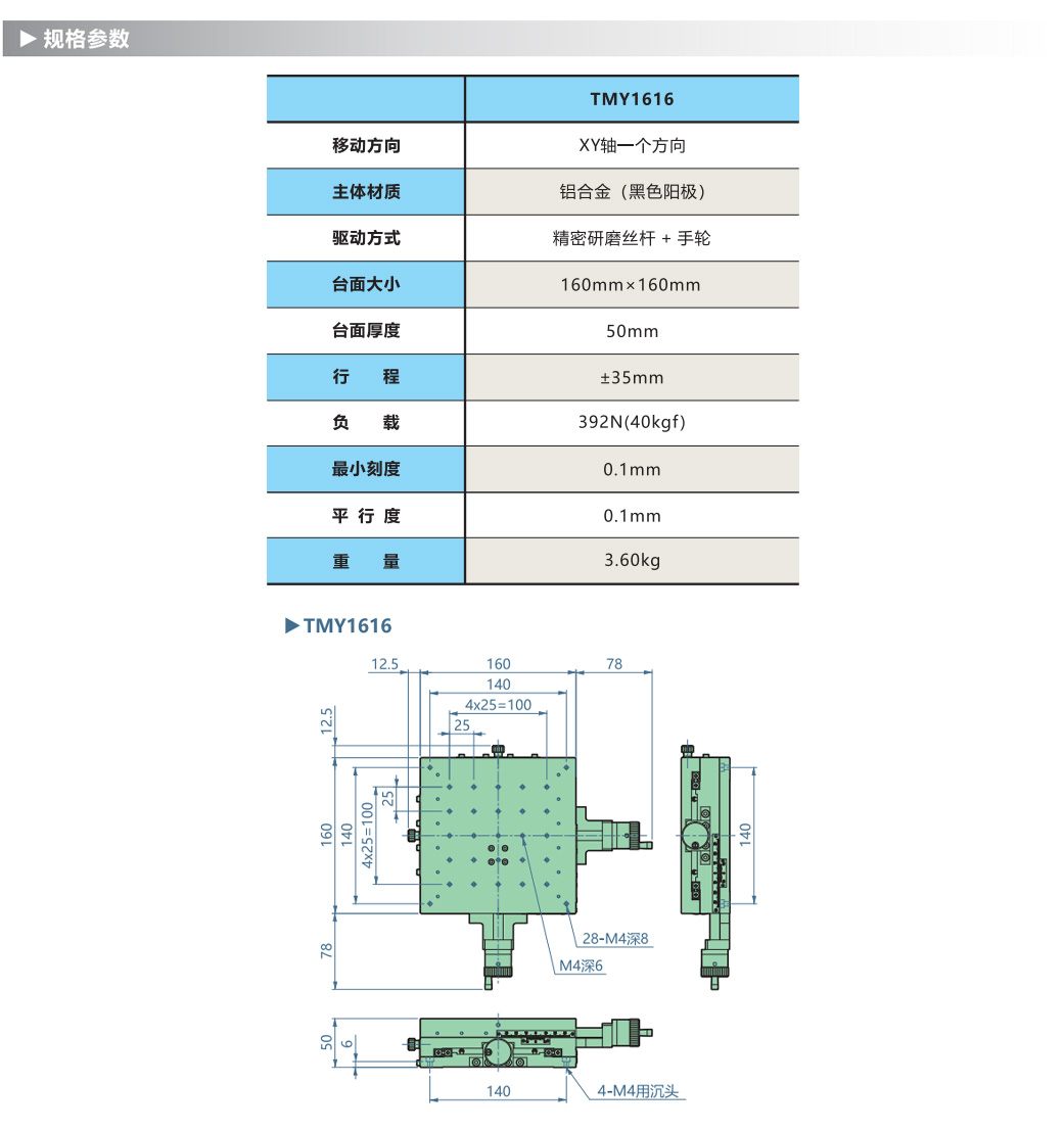 3.驱动方式为精密研磨丝杆+手轮。